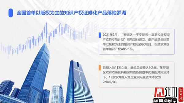 “罗湖区—平安证券—高新投版权资产支持专项计划”是全国首单以版权为主的知识产权证券化项目,也是罗湖区首单知识产权ABS产品。入池企业包括柏星龙创意包装、深圳中国国际旅行社等15家辖区内的优质文创企业,横跨文化、设计、旅游、珠宝等多个行业。