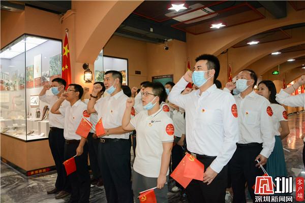 参观活动结束后,全体成员进行了重温入党誓词环节。在鲜红的党旗下,党员们举起右拳,在罗湖区委宣传部二级调研员李文威的带领下庄严宣誓,大家仿佛又看到了自己第一次站在庄严的党旗下宣誓的样子:“我志愿加入中国共产党,拥护党的纲领,遵守党的章程……”一声声铿锵有力的入党誓词在博物馆中回响。