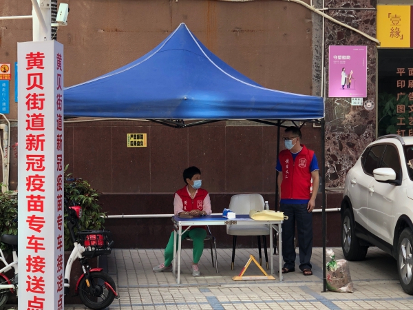 炎炎烈日,为贴心服务群众,黄贝街道设立了接种新冠疫苗专车接送点。接送点的义工告诉记者,在户外工作特别消耗水,一个上午就喝掉四五瓶饮用水,虽然准备了防晒的雨棚,但路上的热空气却躲不掉,一会儿下来也是大汗淋漓,不过能为群众服务,尽快建立全民免疫阵线,这份守候很值得。