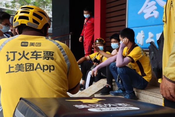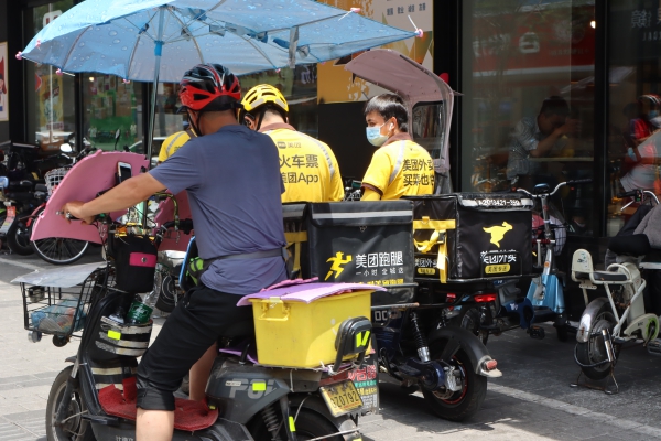 记者看到,街道上像吕先生这样的外卖员数量不在少数,短短十几分钟,记者就看到了近百名外卖员、派送员穿行街头,将订单送达客户手中。他们趁取餐时间,在餐厅门口休息,不少人直接席地而坐,享受一下开放餐厅流出的一丝冷气。