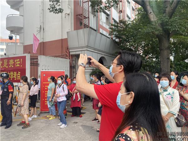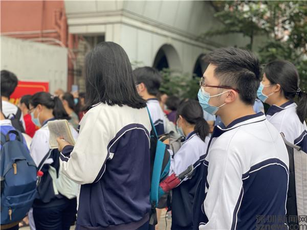 当天上午7:50,记者来到罗湖区翠园中学和罗湖外语学校门口,只见考生们已陆续排队领取准考证,有序进入考场。许多穿着“红旗袍”戴着“红口罩”的家长们在纷纷叮嘱孩子们后,已在校门口等候。