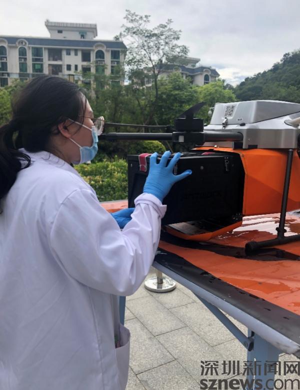 工作人员将装有检验标本的特殊保温箱放入无人机内。