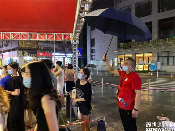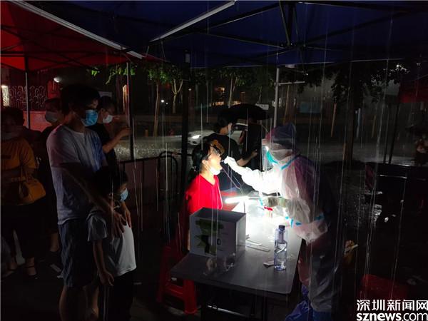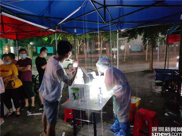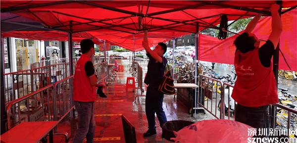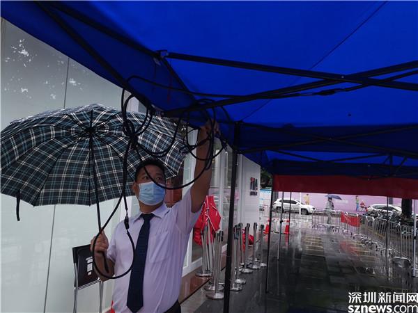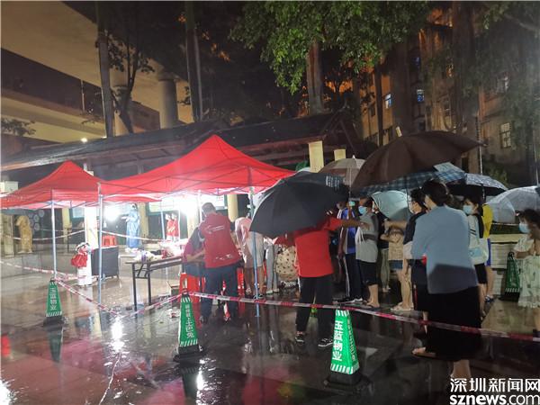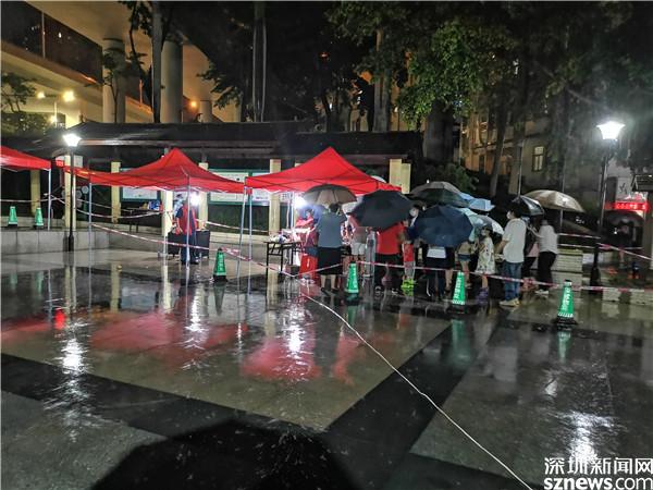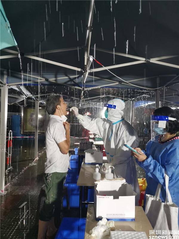 读特客户端·深圳新闻网2021年6月21日讯(记者 李慧)6月21日晚及6月22日一早,深圳雷雨交加,深圳市气象台2021年06月22日07时10分在多个区域发布暴雨红色预警,罗湖也包括其中。有那么一群人,严阵以待、逆雨迎风,坚守在抗疫一线。记者到各核酸检测点看到,医护人员和社区义工们仍然冒着风雨,坚守在核酸采集的岗位上。