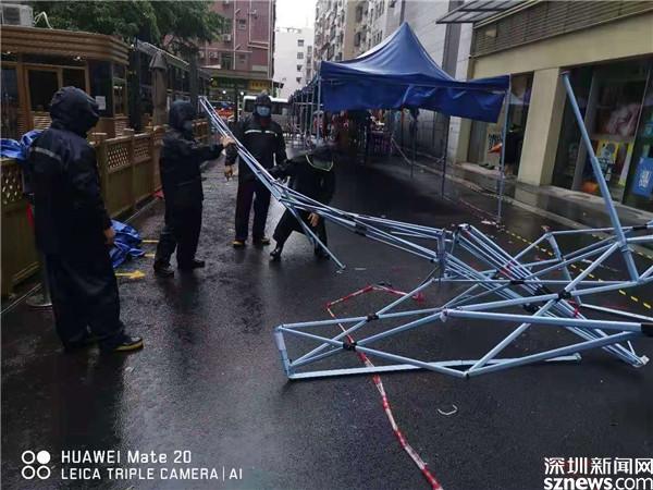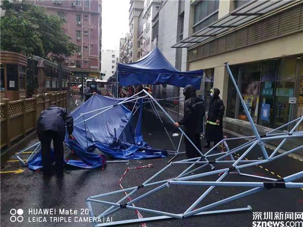 6月22日早上,黄贝街道工作人员在风雨中搭建核酸检测点帐篷。