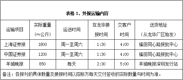 深圳报业集团印务有限公司现承印外报主要有上海证券报、中国证券报、羊城晚报等重要报刊,根据各报刊的具体要求,安全、准时、保质、保量地运送每天生产发行数量的各报刊到指定地点或客户手中,具体运输发行内容和标准详见下面表格。