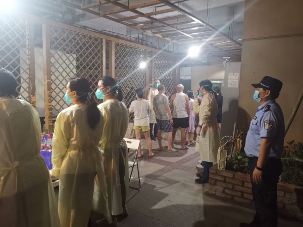 “我们已经协调社康开始发号了,不要急,请耐心等待。”笋岗社康外,一名民警正顶着烈日挥汗如雨,耐心地给居民进行解释,警服肩颈处可见一道道汗渍。