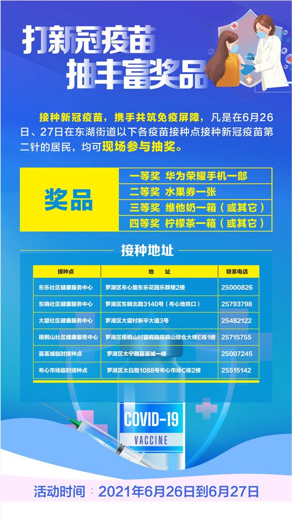 目前,东湖街道共设有6个疫苗接种点:东乐社康中心、东晓社康中心、大望社康中心、梧桐山社康中心、喜荟城临时接种点、布心市场临时接种点,6月26日至27日每天8时至22时间可接种。各位市民朋友们不要犹豫!不要迟疑!赶紧携亲朋好友到东湖街道接种点接种新冠疫苗领取豪华大奖吧!