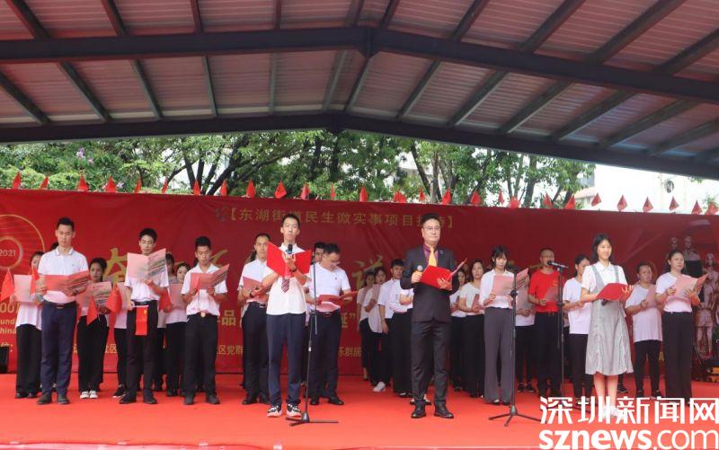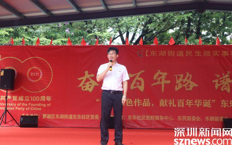 读特客户端·深圳新闻网2021年7月30日讯(见习记者 邱婕 通讯员 黄小花)百年征程波澜壮阔、百年初心历久弥坚、百年成就催人奋进、百年歌声唱响今天。7月30日上午,“百幅红色作品,献礼百年华诞”东乐社区建党100周年庆祝活动在东乐花园文化广场举行。东湖街道党工委副书记、办事处主任刘慧坚,党工委副书记、人大工委主任谢统敏,东湖街道二级调研员、东乐社区第一书记曾列文,东湖街道办事处副主任李民,罗湖区退役军人事务局副局长何朝阳,东乐社区党委书记刘芳,东乐社区社工与义工及广大居民朋友400余人参与此次活动。