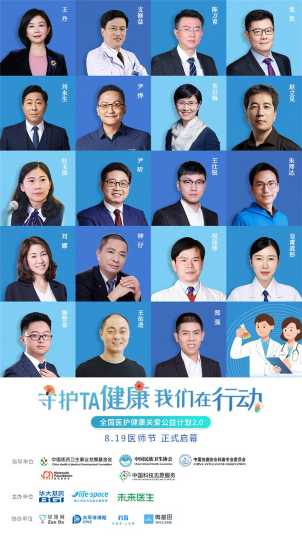 此次公益由中国医药卫生事业发展基金会、中国民族卫生协会、中国抗癌协会科普专业委员会、深圳猛犸公益基金会等机构指导,华大基因、Life-Space、未来医生联合主办,早筛网、太平洋保险、约苗、微基因协办,通过健康关怀礼包捐赠、公益科普直播、线上义诊等系列活动,呼吁全社会关爱医护人员,助力全社会形成“尊医重卫”的文化和氛围;同时借助公益影响力,让关爱辐射更广泛人群,提高全民“早筛、早诊、早治”的健康意识,助力健康中国。