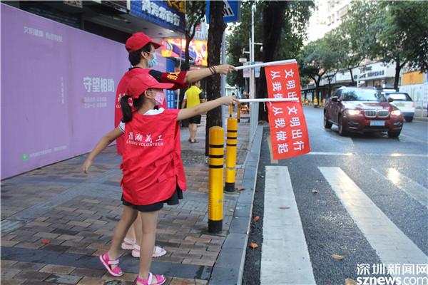 读特客户端·深圳新闻网2021年8月27日讯(记者 刘嘉敏 通讯员 杨纪欧)乘着文明之风,拉住暑假的尾巴,母女一同身穿红马甲,臂戴“创文监督员”的红袖章,做义工劝导交通,倡导“文明出行,从我做起”,让这个暑假更有意义。