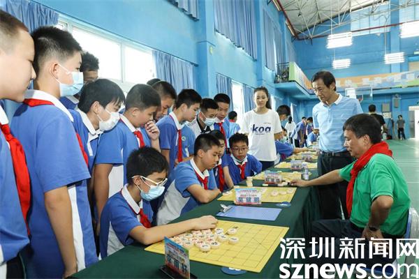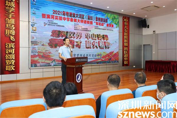 读特客户端•深圳新闻网2021年10月10日讯(见习记者 钟林 通讯员 凌玲)10月10日上午,罗湖滨河实验中学内“狼烟四起”,一片激烈景象,原来,是吕钦、蒋全胜、柳大华、庄玉庭和曹岩磊5位象棋大师齐聚校园,和55名学校师生共同开展2021年粤港澳大湾区(深圳)象棋邀请赛暨滨河实验中学象棋大师进校园“车轮战”表演赛。