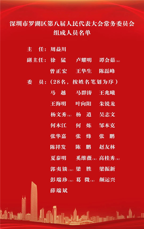 经会议选举,周益川当选罗湖区第八届人大常委会主任,范德繁当选罗湖区人民政府区长,姚文胜当选罗湖区监察委员会主任。徐猛、卢耀明、谭会茹、曾正宏、王华生、陈磊峰当选罗湖区第八届人大常委会副主任。左金平、夏东、于红军、冯健、肖嘉睿、詹辉、霍广勇当选罗湖区人民政府副区长。杨爽当选罗湖区人民法院院长。张彬当选罗湖区人民检察院检察长,根据法律规定,须报经市人民检察院检察长提请市人大常委会批准。获颁当选证书后,新当选人员向宪法宣誓就职。