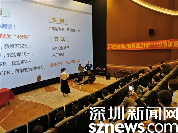 罗湖区委宣传部常务副部长章红班对辖区行业“消防宣传月”进行部署和要求。随后,安全专家讲师罗灵在现场进行了安全知识培训和心肺复苏救助技能培训。