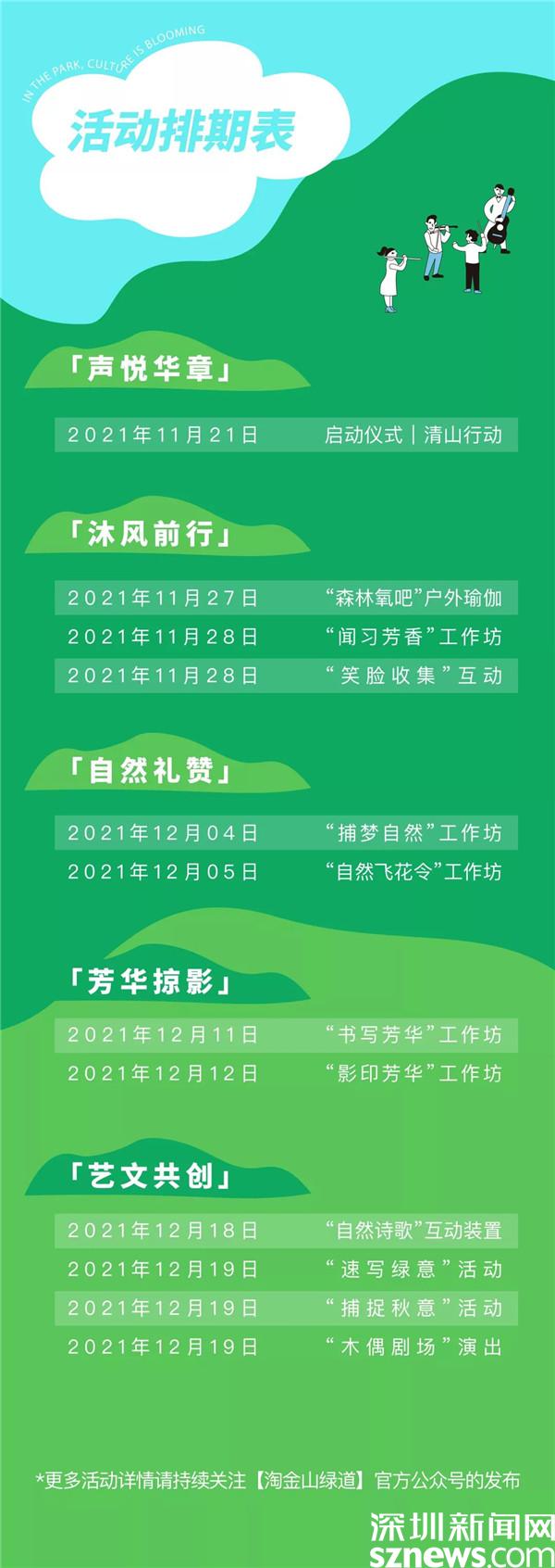 据悉,自11月27日起连续四个周末,深圳公园文化季罗湖分会场将带来一系列健康疗愈、艺术文化、传统文化等户外活动,市民可以通过关注“淘金山绿道”公众号了解更多活动详情,报名参加。