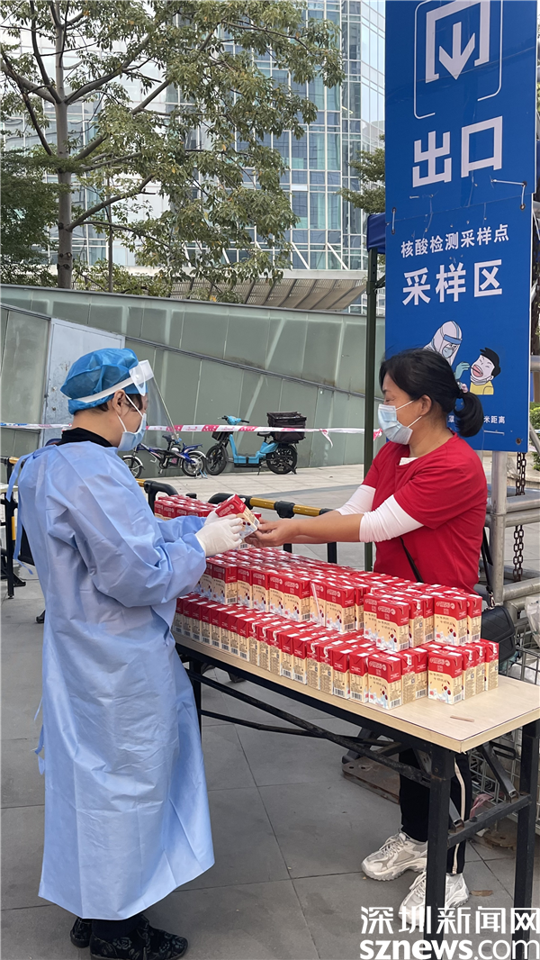 在笋岗街道初心公园核酸检测点,市民在进行核酸检测后可以去领取一瓶牛奶。据了解,这是深圳爱心企业专门为市民和医护人员捐赠的,这一瓶瓶牛奶在深圳的冬天向医护人员和市民送上了一份温暖。