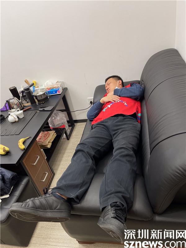 1月10日凌晨5点多,桂园街道桂木园社区党委书记刘剑从核酸检测点回来,躺在办公室的沙发上,连身上的红马甲都没有脱就睡着了。