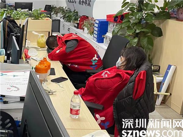 桂园街道疫情防控志愿者1月10日晚上工作到凌晨5点多做数据核查,在办公室的椅子上睡着了。