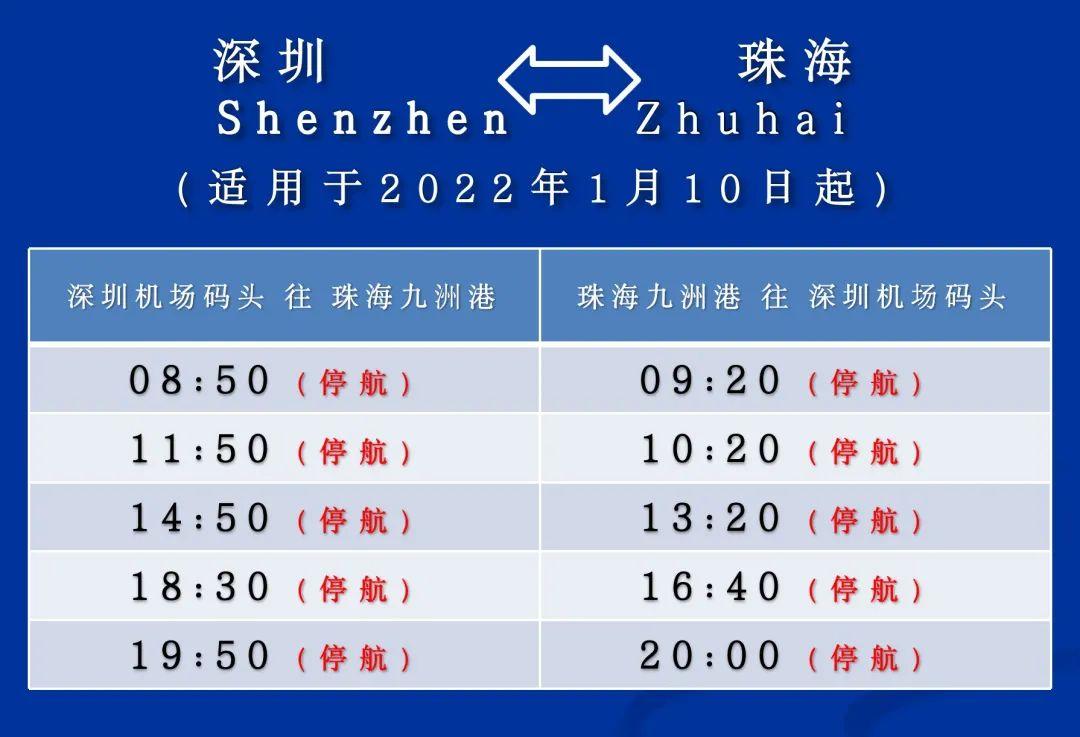 记者从深圳机场获悉,1月10日起,深圳机场码头至珠海九洲港航线船班全部停航,复航时间另行通知。