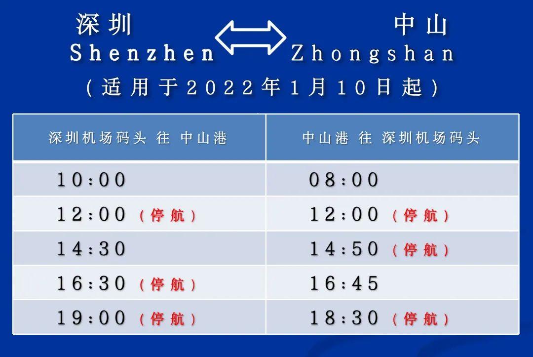 同时,1月10日起,深圳机场码头至中山港航线船班保留每日2进2出:10:00、14:30 深圳机场码头出发前往中山港;08:00、16:45 中山港出发前往深圳机场码头。