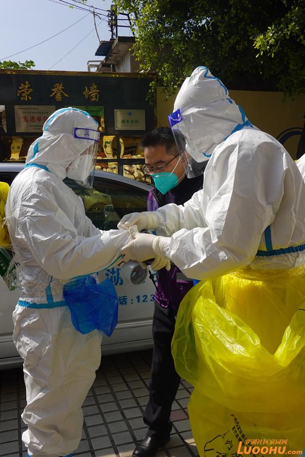 腊八节刚过,深圳带着些许凉意,却也是艳阳高照。“同志们,相互检查一下手腕脚腕有没有贴好!穿戴整齐后准备集结出发啦!”在封控区外围的医护人员整备区,一群身穿防护服、全副“武”装的工作人员整装待发,两人一组,目光坚定,向着封控区的入口走去。