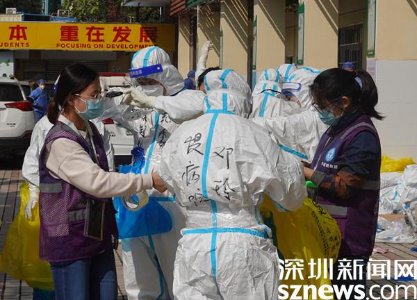 读特客户端·深圳新闻网2022年1月11日讯(记者 刘嘉敏 通讯员 刘嘉丽)“来,我帮你后面的手套盒贴好!”“诶,你看看我的回收袋有没有粘牢?”……1月11日,在深圳市新华外国语学校,一群准备集结出发的核酸采样工作人员正在相互帮忙穿戴防护服。区别于普通的防护服,他们将酒精、手套、回收袋等用胶带粘在腰间,这是基于封控区核酸采样工作的特殊性,大家想出的奇招。