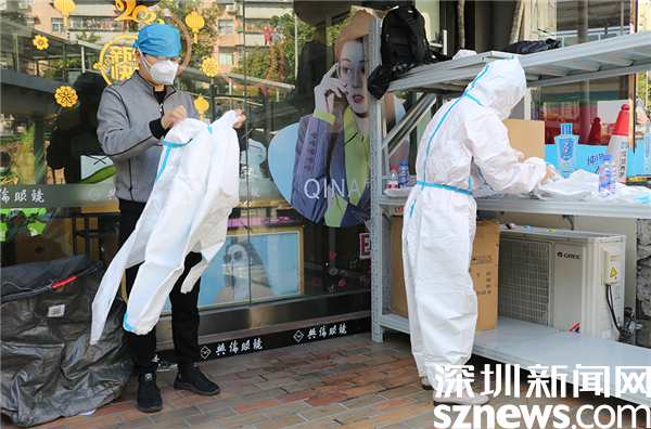 1月12日下午,由罗湖医院放疗科医生张皓昇和护士陈晓燕组成的“导管维护小队”,通过社区和患者确定好上门时间后,立即出发。张皓昇和陈晓燕携带了一次性换药包、PICC透明敷料、无菌治疗巾、抽血物品、消毒液等医疗物资,打车前往罗湖清水河街道管控区出入口,准备换上防护服后步行来到患者所在的楼栋,为患者进行健康评估、PICC管道维护和抽血等操作。