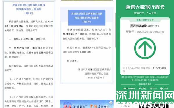 读特客户端·深圳新闻网1月26日讯(记者 覃钰清)1月25晚,罗湖区新型冠状病毒肺炎疫情防控指挥部办公室发出通告,通告指出,自2022年1月26日零时起,罗湖区清水河街道解封相关封控区、管控区,同时调整罗湖区清水河街道鹤围村58栋、鹤围村64栋等两区域由中风险地区调整为低风险地区。调整后,深圳市全域均为低风险地区,不再执行“持48小时核酸阴性证明离深”管控措施。