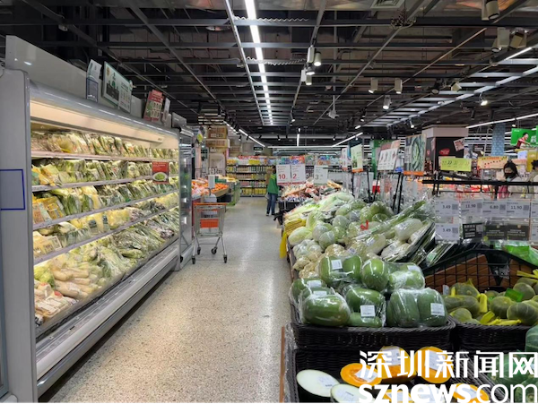 最后,记者走访了周边超市,看到蔬菜瓜果一应俱全,供应充足。