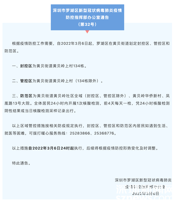 夜间,深圳市罗湖区新型冠状病毒肺炎疫情防控指挥部办公室发出通告,自即日起,在黄贝街道划定封控区、管控区和防范区。