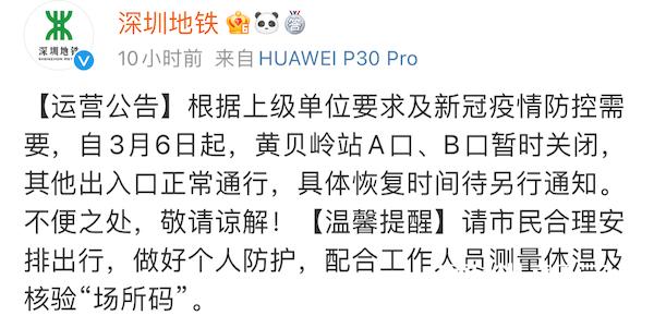 上午8时,深圳地铁发布运营公告:3月6日起,黄贝岭站A口、B口暂时关闭,其他出入口正常通行。