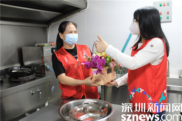 在社区厨房,老围社区居民周文清正在忙碌,疫情开始以来,社区担负着下沉人员和医务人员的中餐和晚餐,每餐四五十人吃饭,任务繁重,厨师一人根本忙不过来。家住老围花园的社区居民赖秀文、周文清得知情况后,立刻赶来帮厨,洗菜、切肉、炒菜、分装饭盒、搞卫生,样样都抢着干。罗湖区最美家庭赖秀文,一连两个星期在社区帮厨,发挥她高超的厨艺,将每一道菜都做得色香味俱全。有了这些热心居民的协助,一线人员得以及时吃上热乎乎的饭菜,保障了防疫工作有序进行。她们用自己的方式参与疫情防控,为社区安宁贡献一己之力。