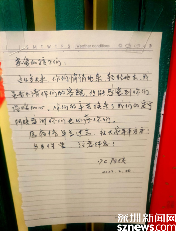 “亲爱的孩子们,这么多天来,你们悄悄地来,轻轻地去,我虽看不清你们的容颜,但能感受到你们温暖的心。你们的辛苦换来了我们的安宁,阿姨感谢你们也心疼你们。”这是来自桂园街道华瑞大厦B座居民的手写感谢信,一句“亲爱的孩子们”戳中了现场工作人员的心,让人忍不住泪目。