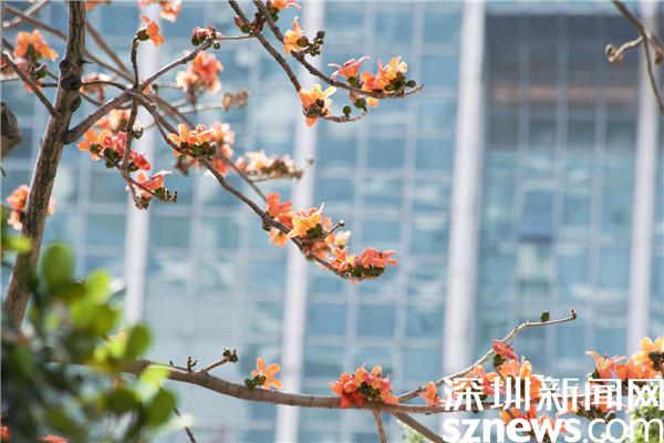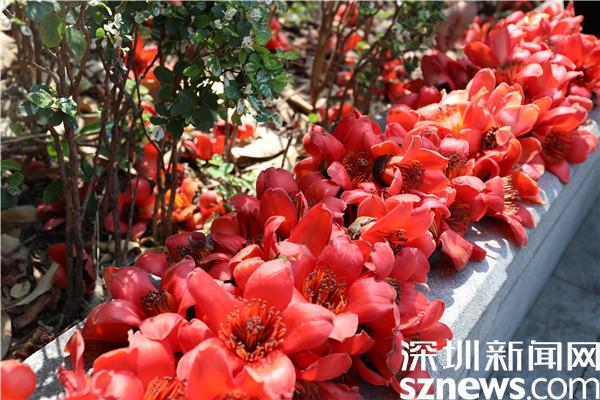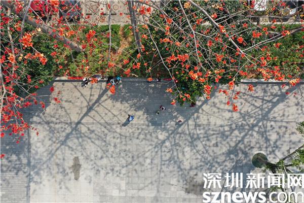 赤焰灼灼的木棉花开了,染红了辖区半边天际,与深圳蓝相映成趣。一朵朵嫣红的花儿垂满枝头,沐浴着暖春的阳光绽放,也点缀着花下赏花的居民们。