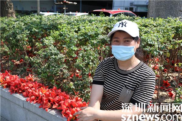 正在文锦花园广场捡木棉花的李女士说:今天出来晒太阳的时候看到木棉花掉落,于是捡了些想晒干泡水喝,目前的这几天的慢生活安排是,配合政府政策,不乱走,把身体养好,为这个城市出一份力。