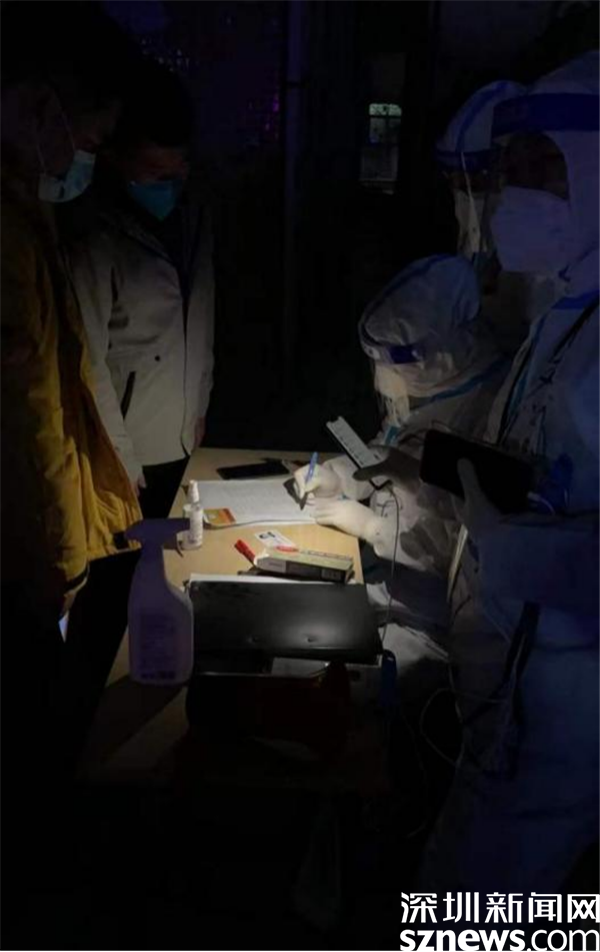 ▲临时工作场所尚未配备照明设备,下沉干部打着手机闪光灯登记居民采样信息