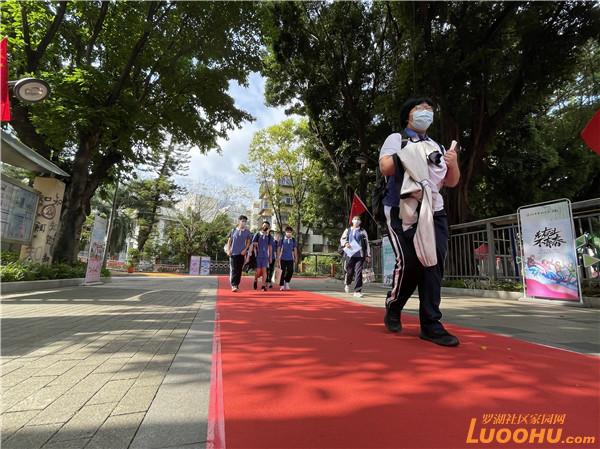 蓝天白云下,背着书包的莘莘学子走上红毯,一旁的幕布写着偌大的八个字:罗湖实验、欢迎回家。深圳市罗湖实验学校的返校颇具仪式感,校门口一席红毯,校园栏杆彩旗飘飘,孩子们在一片喜气洋洋的氛围中回到学校。