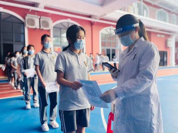 进入阔别已久的校园,兴奋和激动的心情溢于言表,提前两天入校的初三年级学生做出了表率:用餐队伍一米距,透明隔断搭建的用餐区明亮又温馨;课间时间在班主任的带领下,大家排队测核酸,安静、有序的队伍让“大白”对学生点赞。少年已归,向阳而生;不忘初心,逐梦而行。这个夏天,老师带领着学生们一边防疫,一边学习,合力同行,一起向未来!