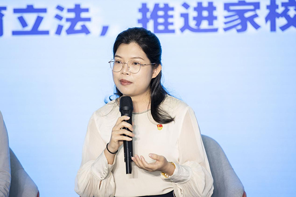 “家长要做好家庭教育,家庭教育要配合学校教育,学校和家庭配合是做好家庭教育的关键”,家长代表深圳市儿童青少年健康发展协会理事安天丽也谈到自己对家、校、社各尽其职、合作共赢的理解,她认为家长要积极创建各种亲子家庭活动,紧密亲子关系;积极参与社区组织的家庭教育指导和实践活动,提升家庭教育能力;同时为孩子创造社会实践的机会。