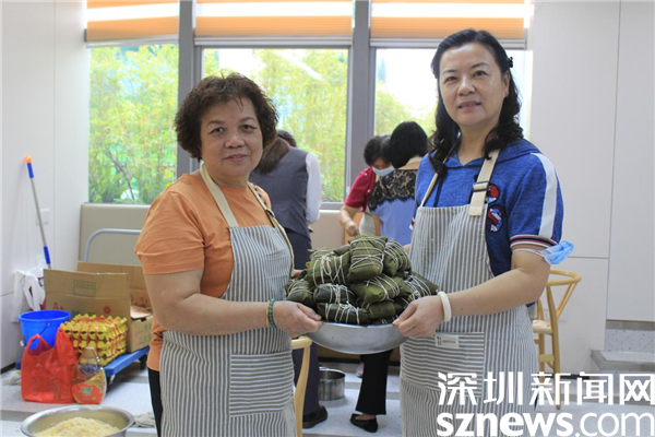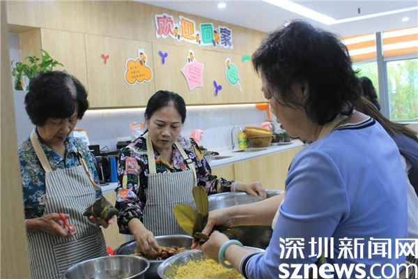 一起包粽子的30名“大厨”中,有社区居民,也有辖区企业员工。年龄最大的73岁,是老围社区的蔡屋围村民,年龄最小的25岁,是辖区企业员工。只见她们围桌而立,双手包着粽子,嘴里说着家常,脸上带着笑,没多大工夫,一个个有棱有角的粽子就在大盆里堆成了小山。每一颗粽子都有家的味道,都带着满满的祝福和对美好生活的憧憬。不少居民在老围社区出生长大,一住就是一辈子,她们见证了社区家园日新月异的变化,她们热爱这块土地,热爱老围社区。
