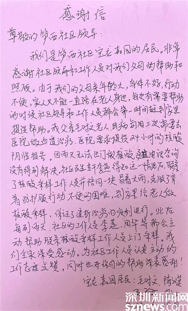 读特客户端·深圳新闻网2022年6月13日讯(记者 刘嘉敏 通讯员 李秀甜)近日,罗湖区笋岗街道笋西社区宝龙嘉园住户毛时文的老伴陈汉英阿姨来到笋西社区工作站,送上了一封手写的感谢信,感谢社区提供贴心的上门核酸采样服务。
