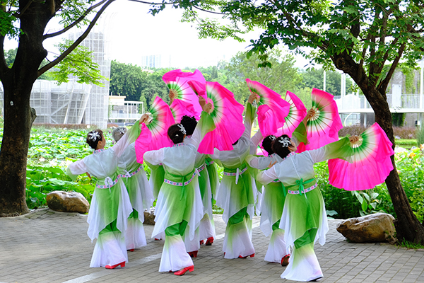 走进公园,映入眼帘的是一望无际的荷叶。一阵微风拂过,嫩绿的莲蓬轻轻点头,硕大的荷叶随风摇摆,让人心旷神怡。荷塘边,身着红色连衣裙的阿姨们正随着音乐舞动;池塘的另一头,身着碧绿服装的阿姨们热情洋溢地表演着扇子舞。