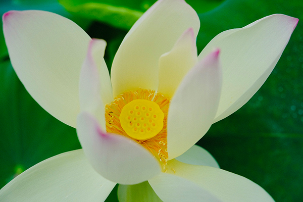 绽放的荷花,粉白的花瓣一瓣一瓣向外舒展,花蕊仰着嫩黄的小脸,含笑地向你看来。