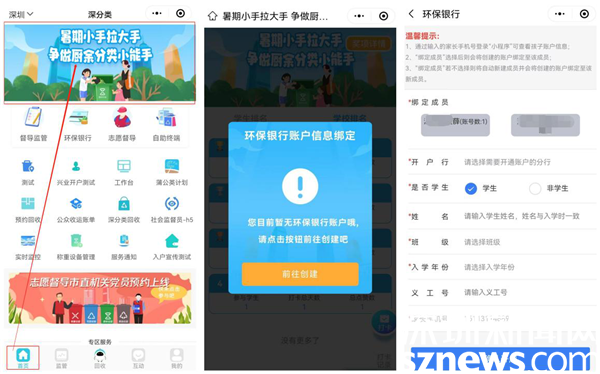 学生及家长可通过“深分类”小程序首页主题活动入口进入活动。在参与活动之前,学生所在学校需开通环保银行支行,学生需注册所在学校支行的环保银行账户,并在活动中进行账户信息绑定、上传参与学生照片才可参与后续打卡集赞活动。
