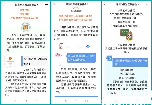 为进一步宣传《慈善法》,普及慈善知识,罗湖区慈善会通过“深圳市罗湖区慈善会”微信公众号推出三期“慈善知识知多少”宣传,针对慈善活动、慈善组织、慈善捐赠、慈善募捐、税收优惠等内容,向社会公众普及慈善知识,传播慈善理念,培育公民慈善意识,规范慈善行为,倡导社会各界一起学善、知善、行善,弘扬慈善文化,营造良好慈善氛围。