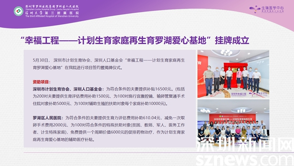 今年初,深圳市计划生育协会、人口基金会就创建了一项“幸福工程”,旨在为计划生育家庭再生育提供帮助。今年5月30日,第一个幸福工程基地就选择坐落于罗湖医院,项目为符合条件的夫妻提供总额高达16500元的医疗补贴,同时,罗湖医院还给予相应的医疗减免,包括手术及药品费用的配套补贴。为居民再生育提供了很好的帮助,大大降低了经济压力,让更多的家庭愿意再生育。