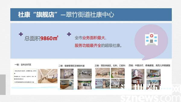2021年3月,全市业务面积最大、服务功能最齐全的罗湖医院集团翠竹街道社康中心投入使用。总面积9860平方米共有4层,分设不同功能区。一楼为诊疗区,涵盖全科诊疗区、专家工作室、医学影像检查区等;二楼为健康管理区,为居民提供全周期的健康体检及检后健康管理服务,还设有超声、检验、DR等科室;三楼为预防保健区,口腔科、妇科,四楼为高危儿早期康复中心、名中医馆、中医康复理疗区。