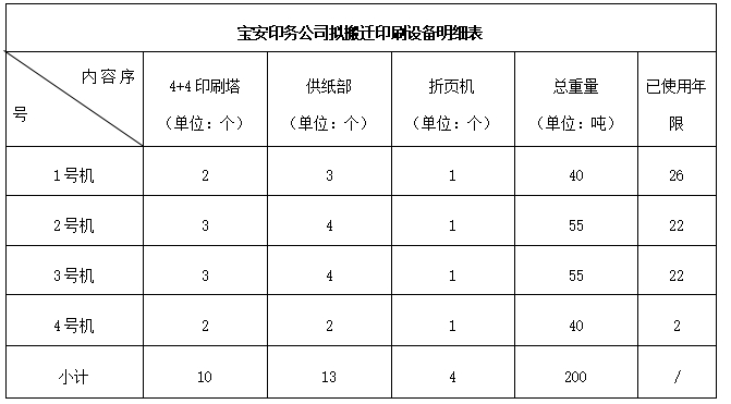 本项目为深圳报业集团宝安印务整体搬迁印刷设备吊装项目,搬迁设备为4台高斯SSC印刷设备,施工区域包括:设备起拆点深圳市宝安区流塘路宝安日报报社院内、安装点深圳市龙华区清丽路深圳报业集团传媒产业园备用线。印刷设备具体情况如下: