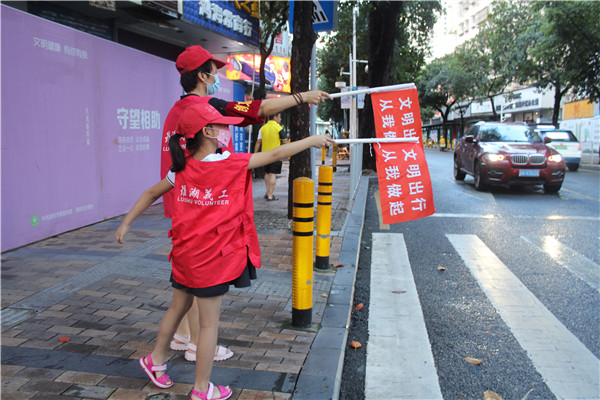 母女一同身穿红马甲,臂戴“创文监督员”的红袖章,做义工劝导交通,倡导“文明出行,从我做起”,让这个暑假更有意义。8月25日下午,一场骤雨过后,罗湖区桂园街道老围社区党群服务中心的7位义工,在社工的带领下上岗了。