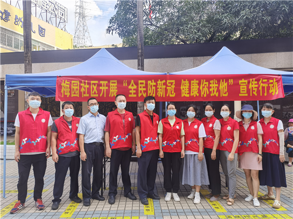8月28日上午,深圳市罗湖区清水河街道梅园社区党委组织辖区党员志愿者、社工在红岗西村广场开展“全民防新冠 健康你我他”宣传行动。