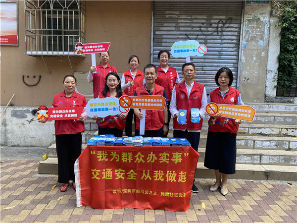 5月21日,深圳市罗湖区清水河街道梅园社区党委联合共建单位读特、深圳新闻网党总支,在红岗西村公交站台周边开展“我为群众办实事-交通安全从我做起”平安宣传活动。